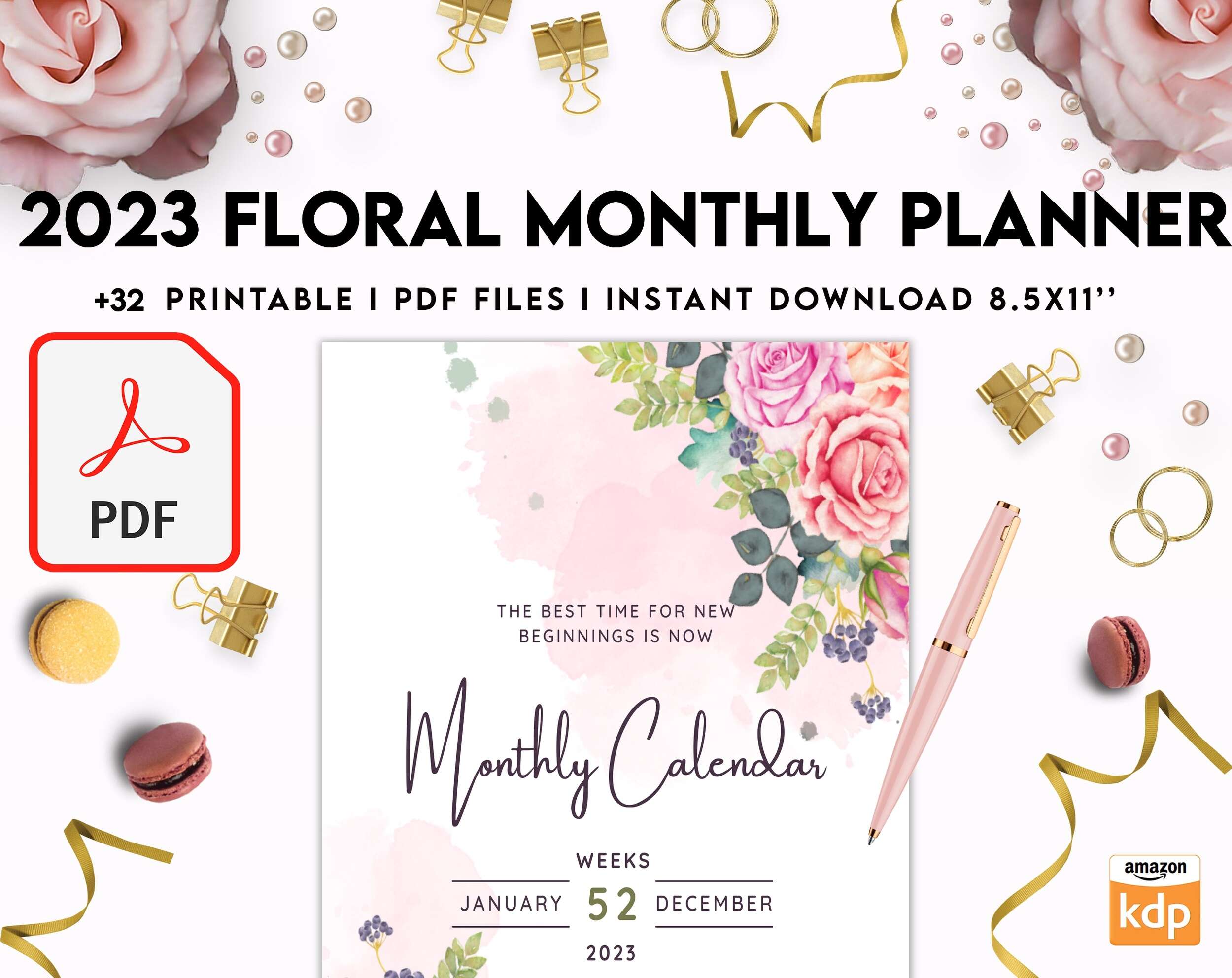 2023 Floral Monthly Planner, Dated 2023 planner Calendar Printable KDP interior PDF file 8,5×11 inch
