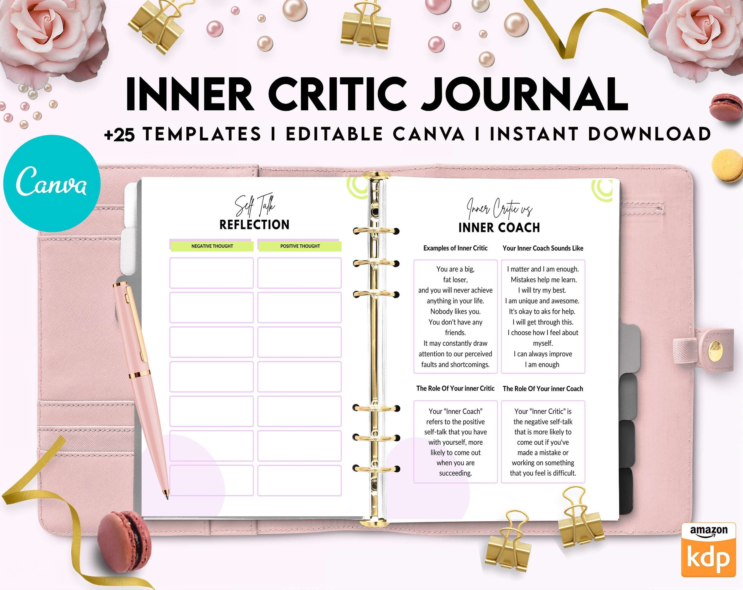 Discover our awesome INNER CRITIC JOURNAL Editable Canva Template for KDP interior. Size 8.5 x 11 inches. Clean, nice and modern design.