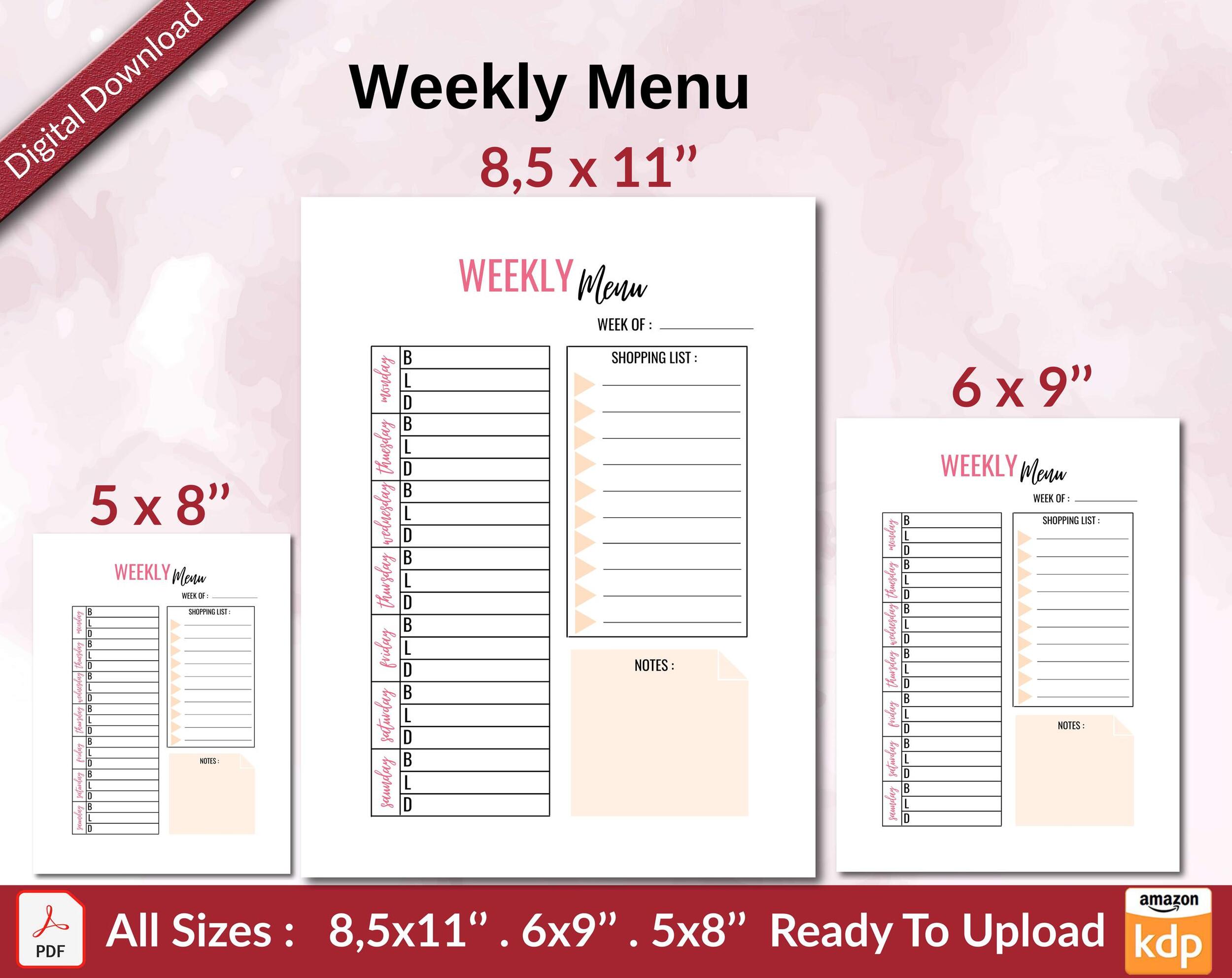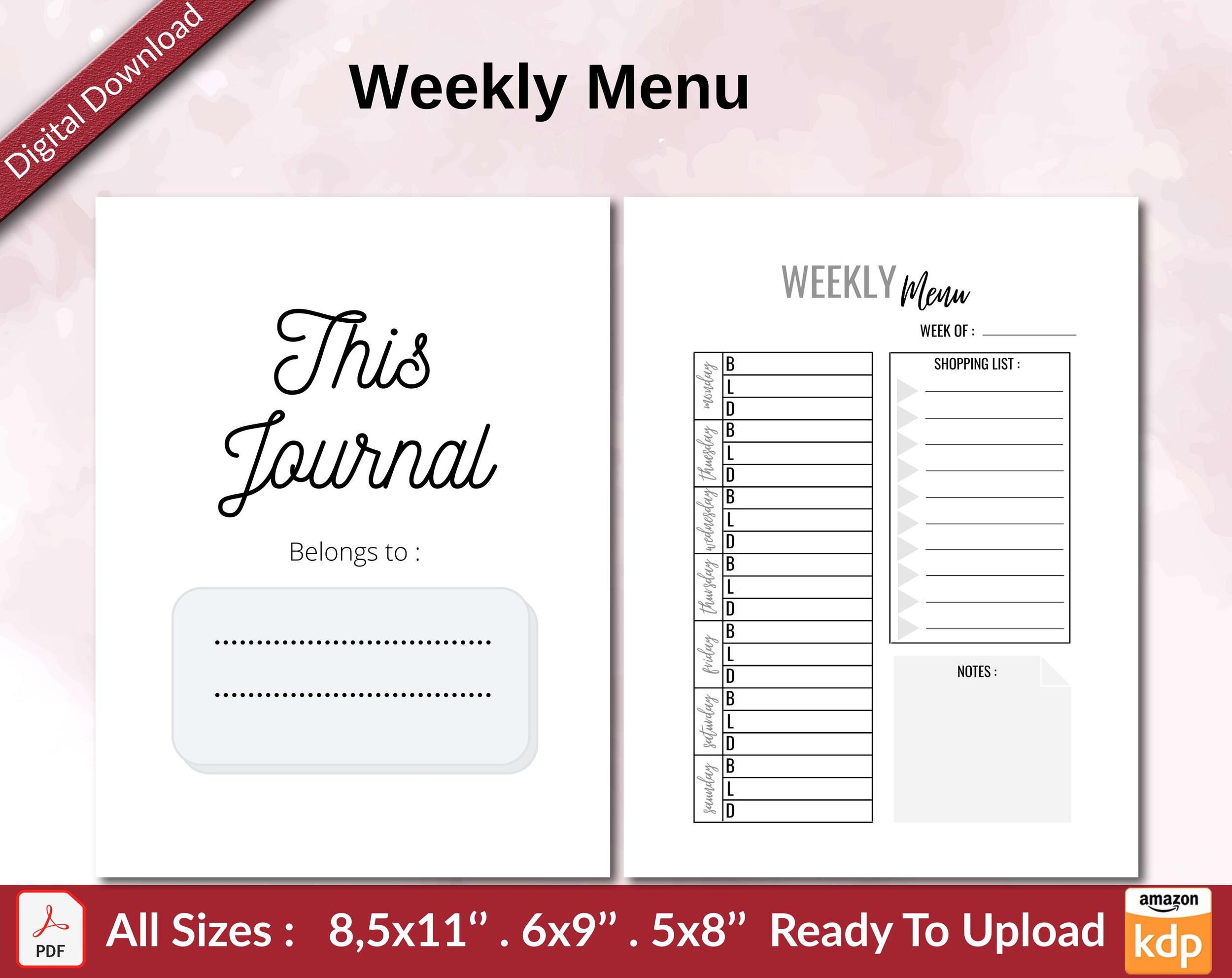 Discover Our Awesome Weekly Menu READY TO UPLOAD interiors preformatted for KDP Journals, Low content book, Notebook, Planner … on Amazon KDP (Kindle Direct Publishing), Commercial use.This package contains: