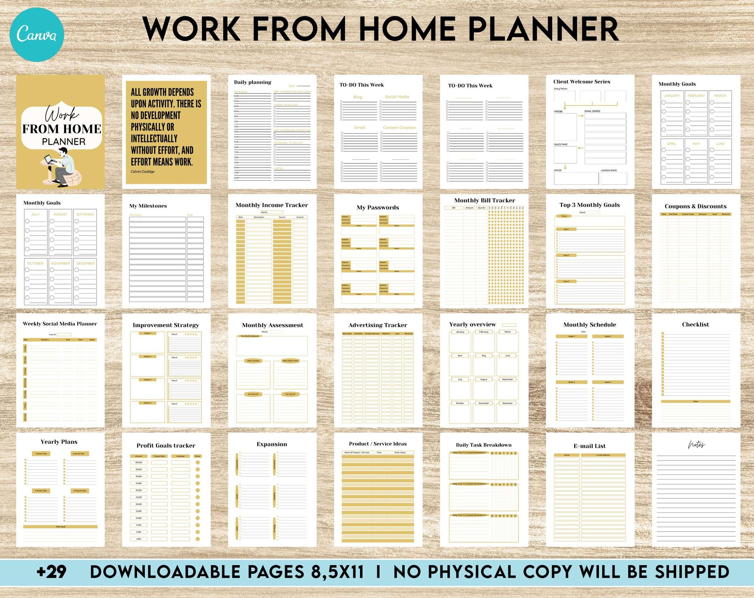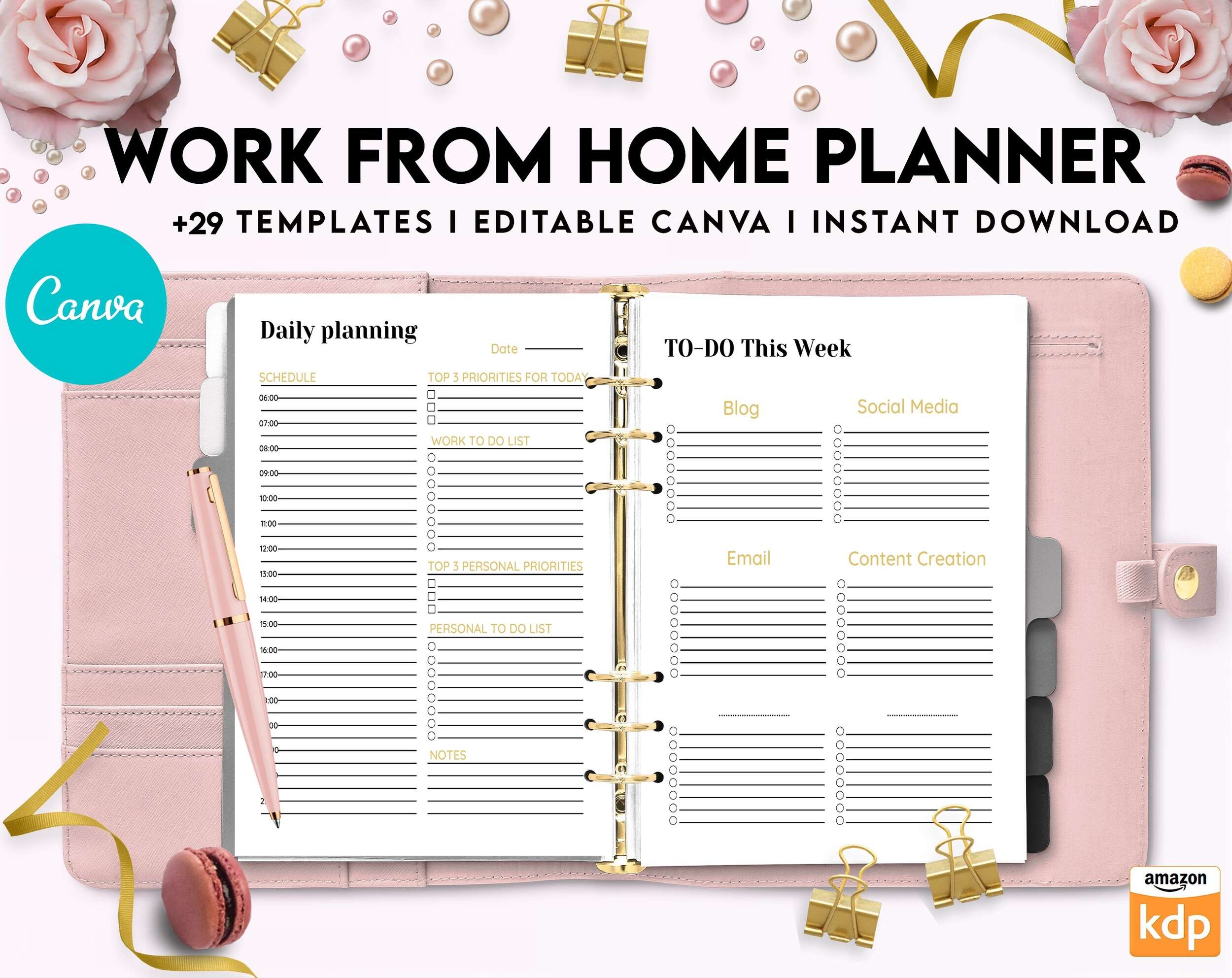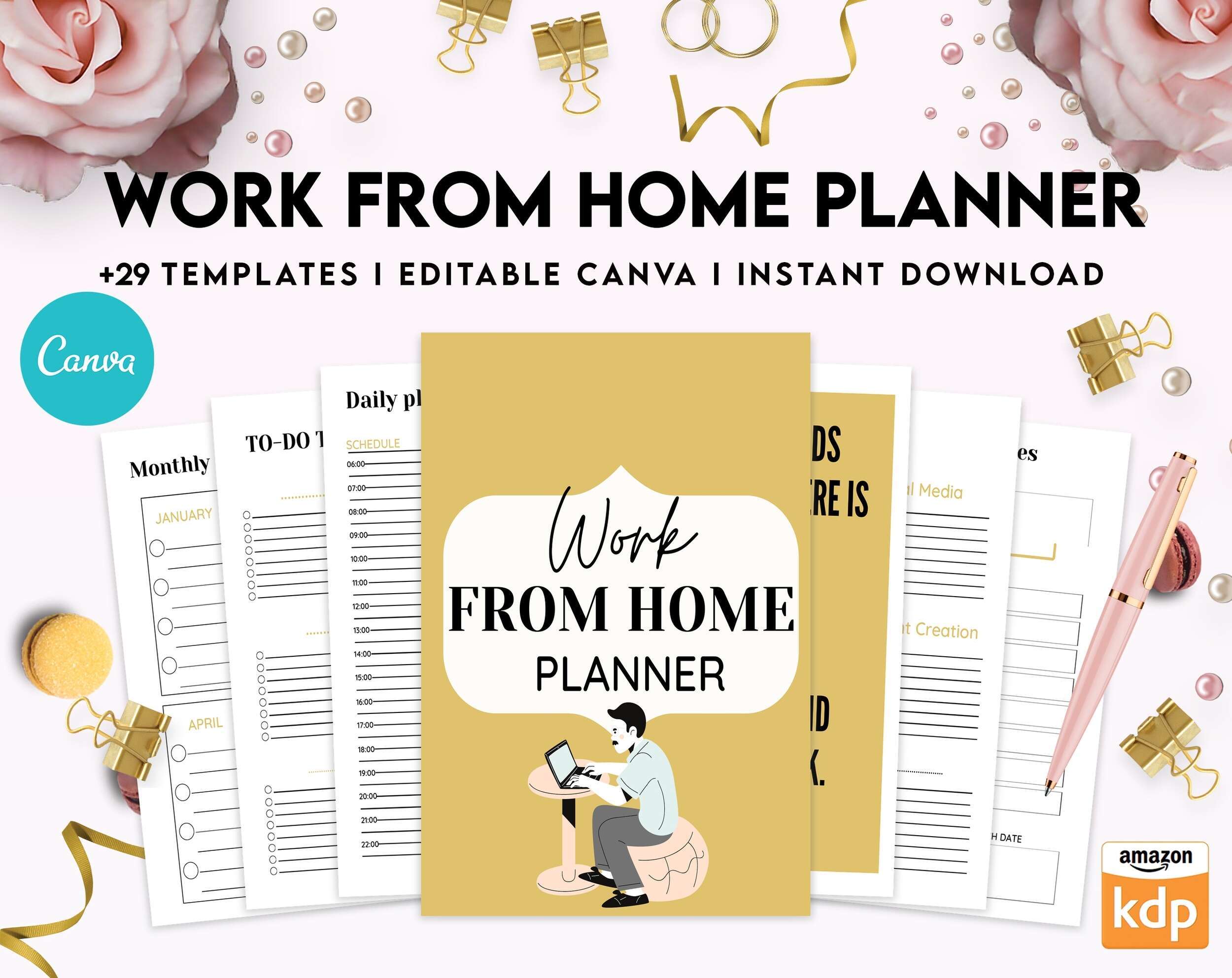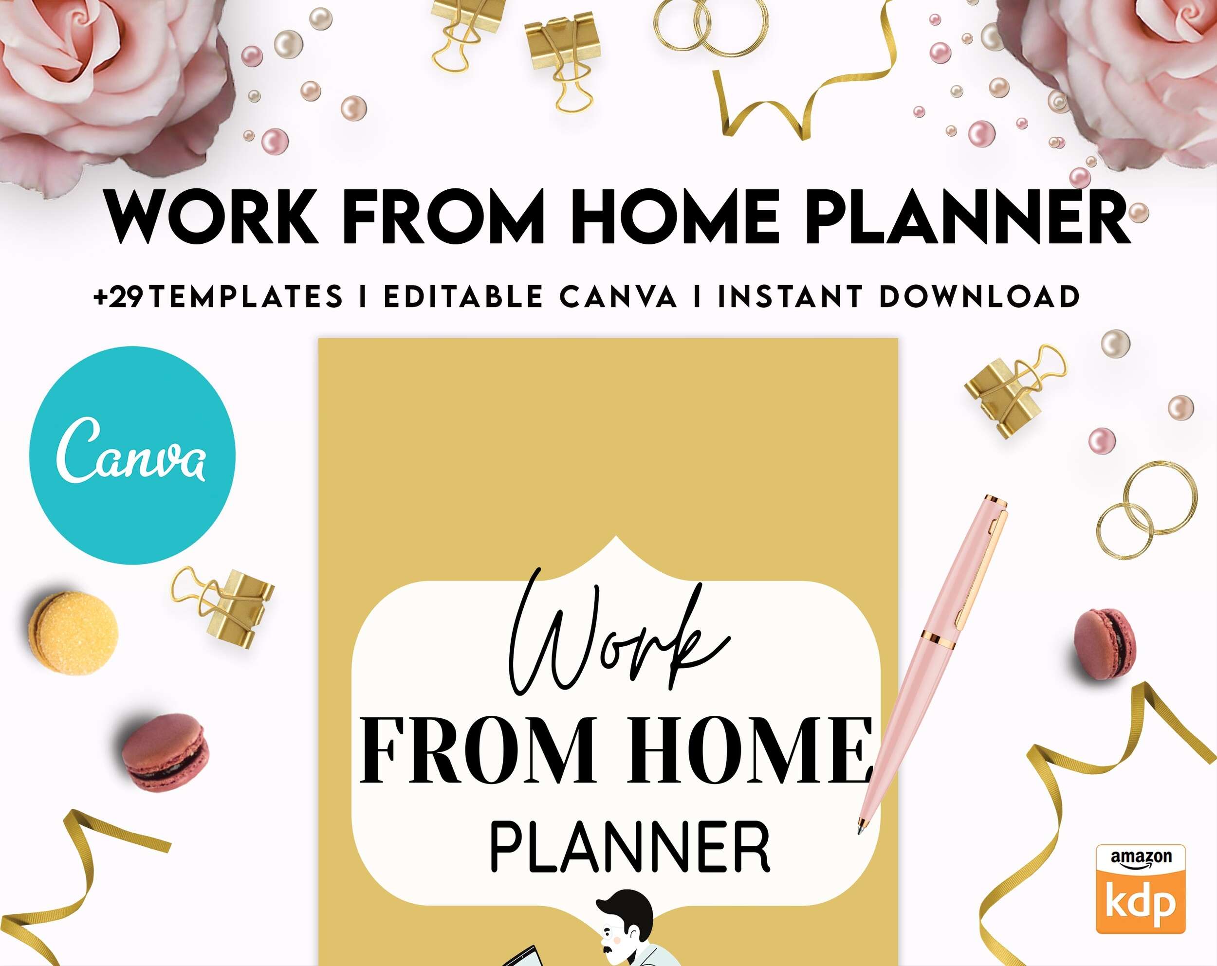 Discover our awesome WORK FROM HOME PLANNER Editable Canva Template for KDP interior. Size 8.5 x 11 inches. Clean, nice and modern design.
