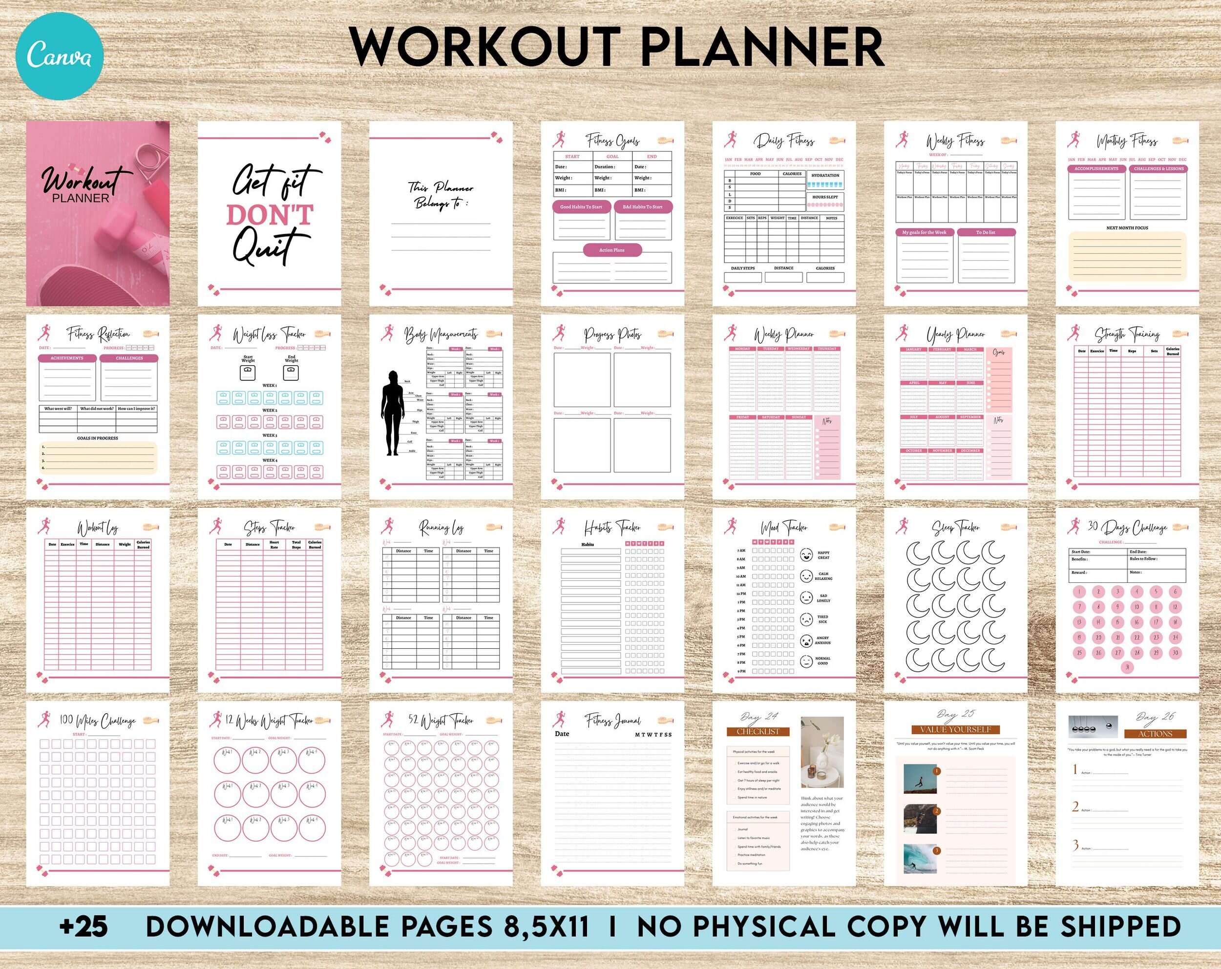 Discover our awesome WORKOUT PLANNER Editable Canva Template for KDP interior. Size 8.5 x 11 inches. Clean, nice and modern design.