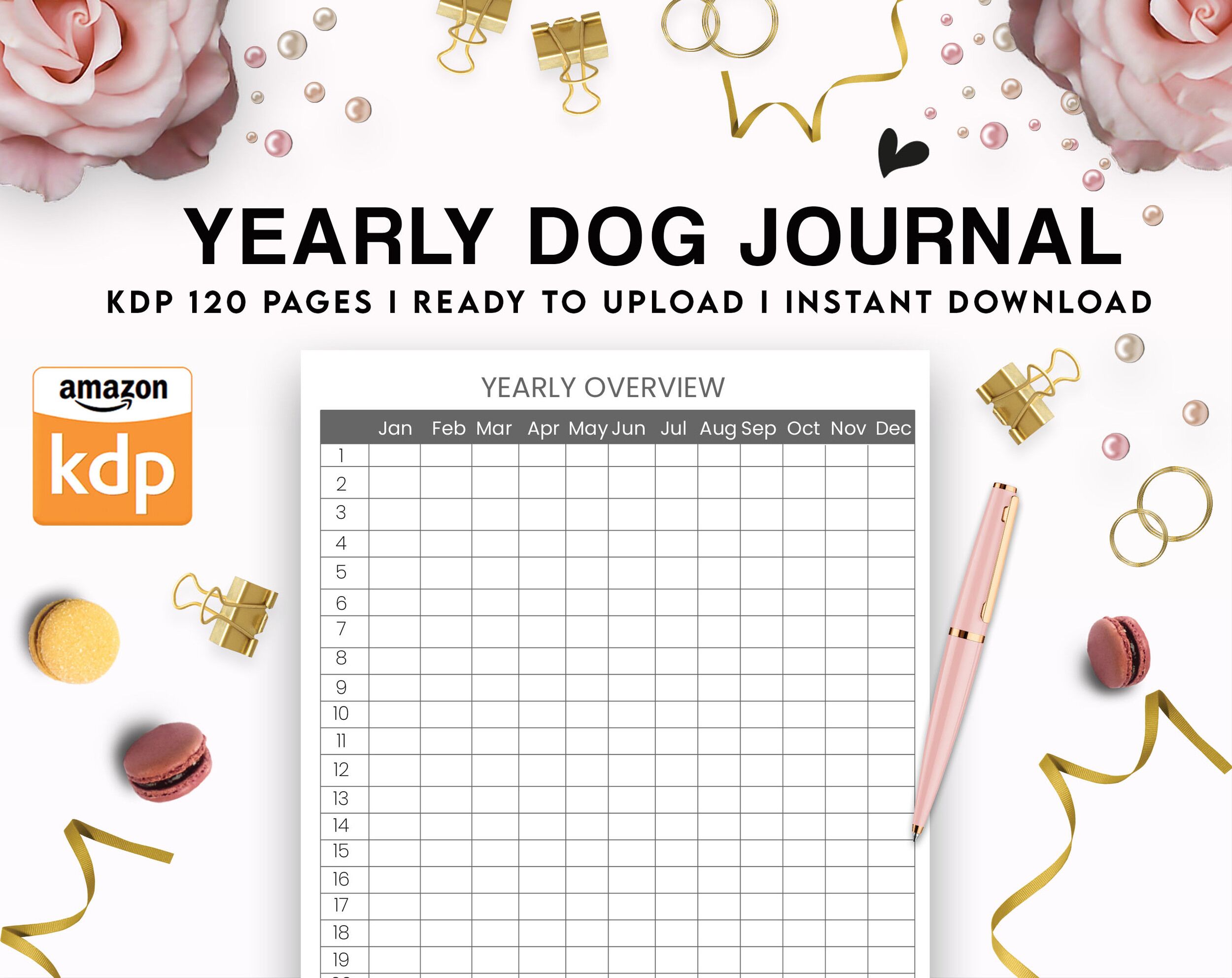 Yearly dog journal ready to be uploaded for Amazon KDP (Kindle Direct Publishing). Perfect for low content books, including vet journals, planners,and more.